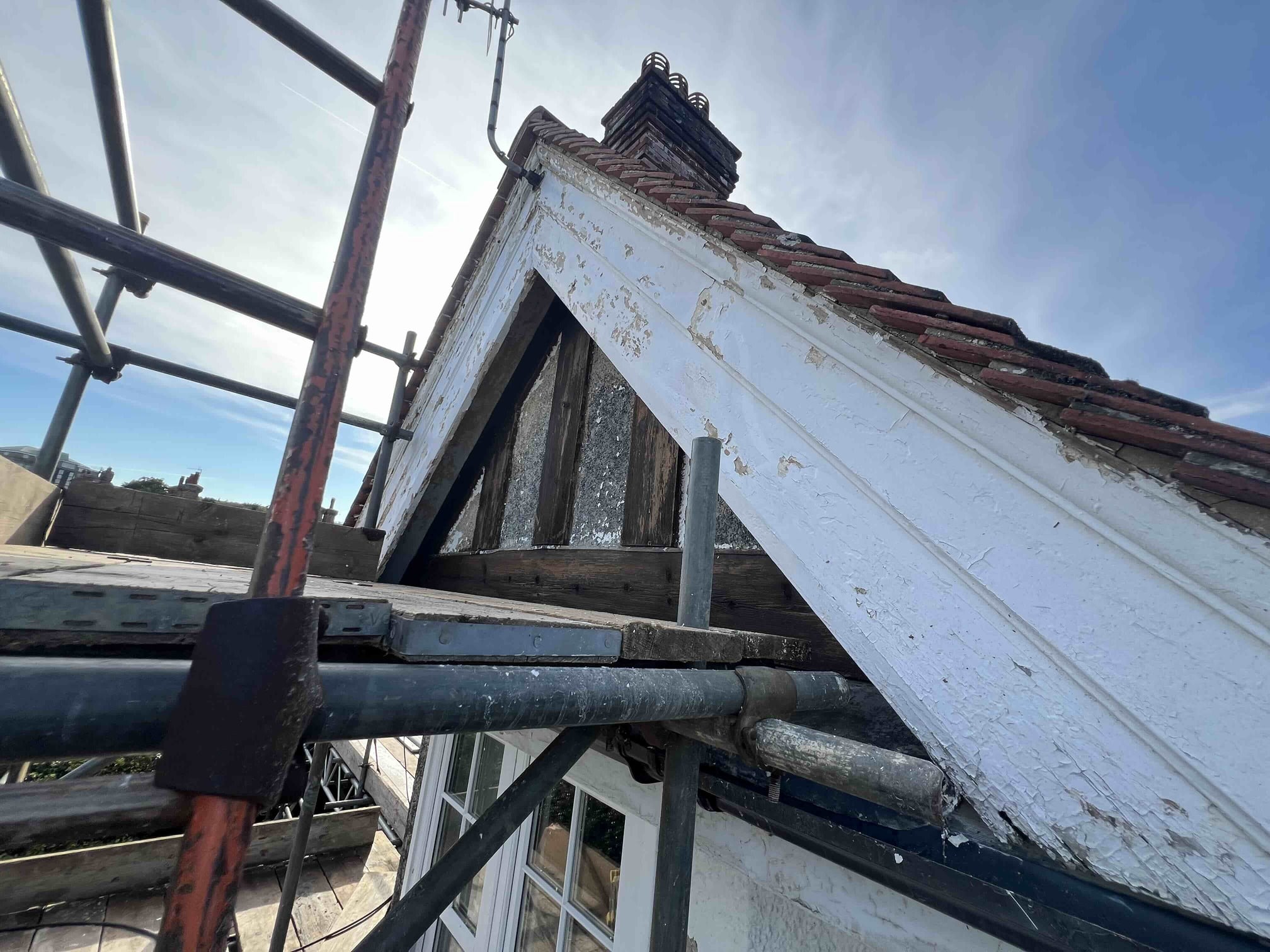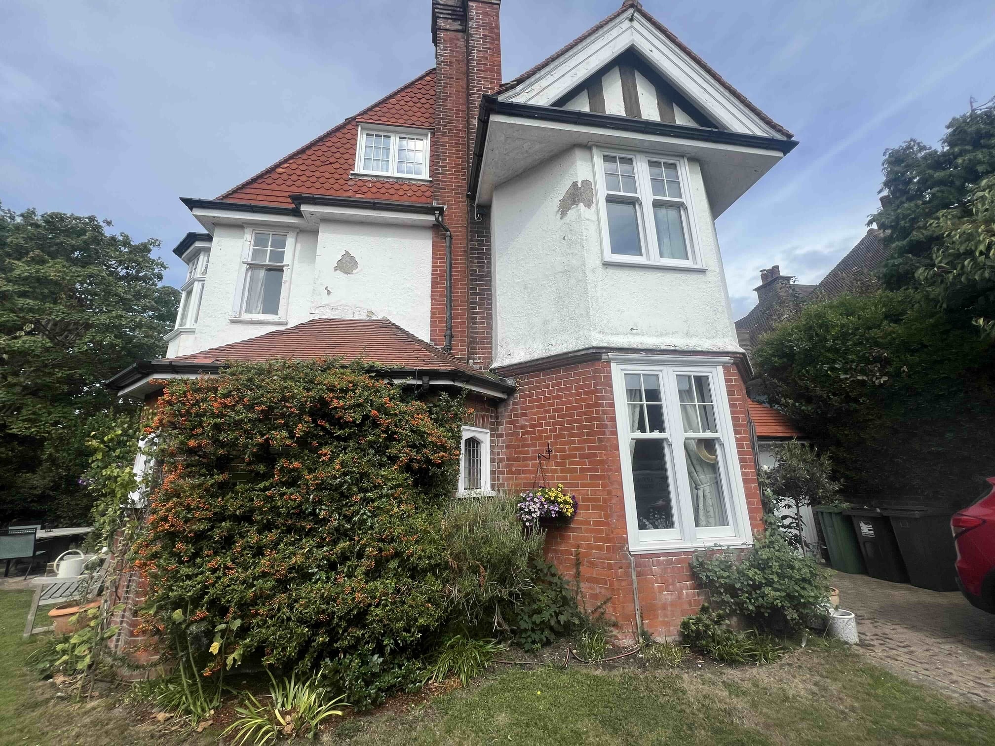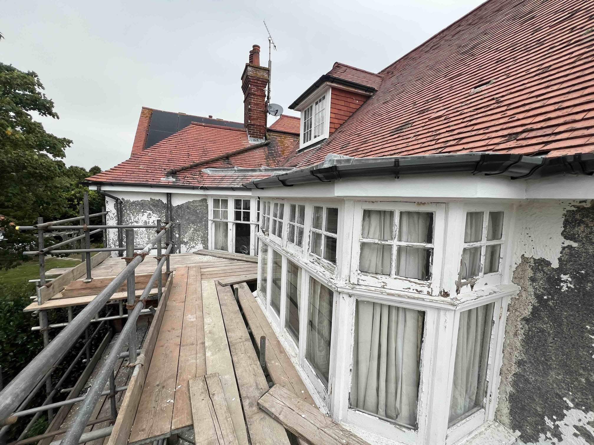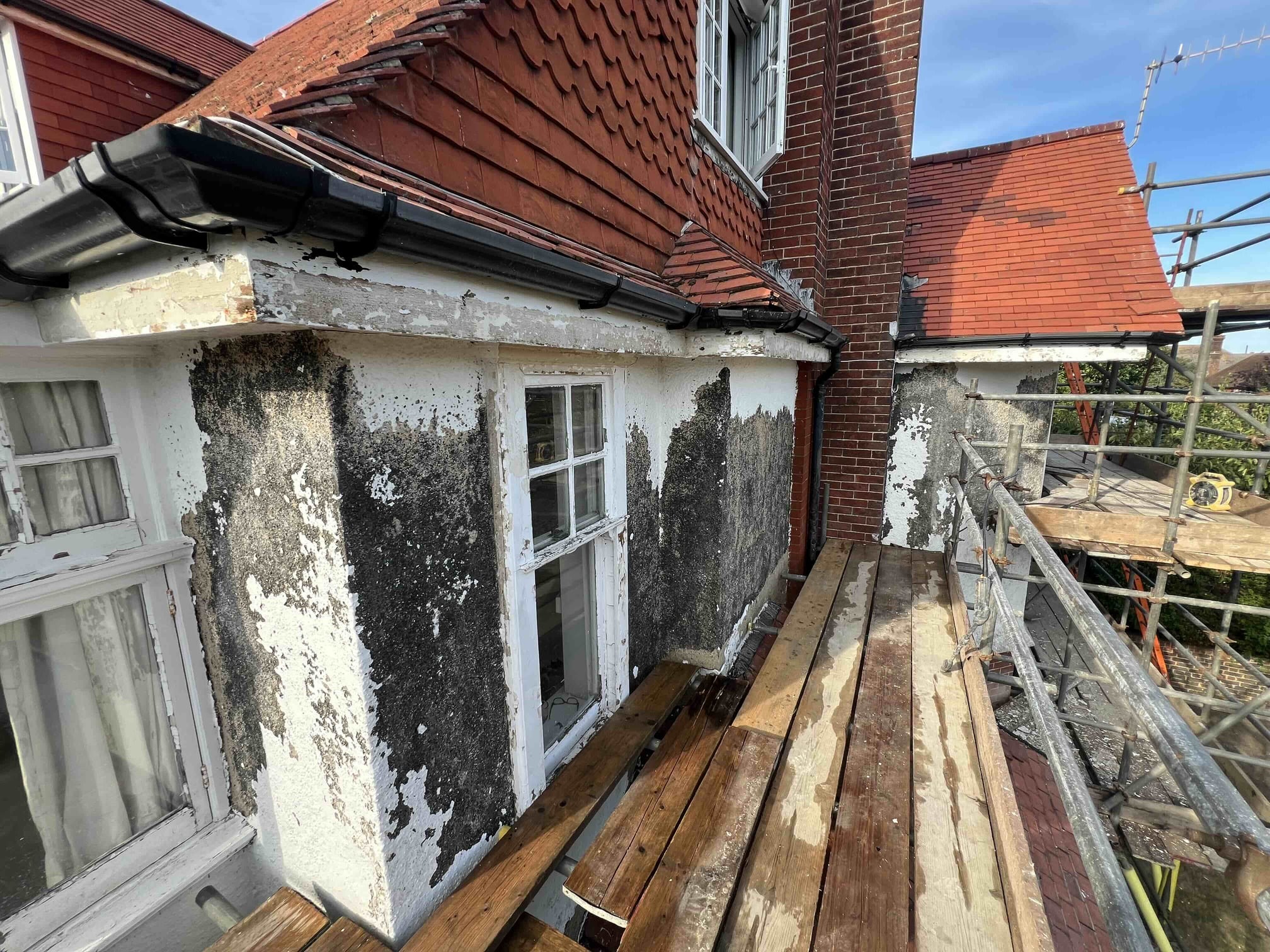 External repair and refurbishment works were carried out on a residential property in Eastbourne, where the building required extensive maintenance. Scaffolding was erected to allow full access to the façade, which had areas of crumbling render, loose mortar, deteriorated woodwork and flaking paint. Repairs included scraping back unstable mortar, sanding and restoring timber elements, and using epoxy to rebuild damaged sections of woodwork and seal gaps around roof tiles. Cement was applied to repair defective areas of the exterior before being finished in white paint. The front door was also sanded and repainted, leaving the property fully restored and looking like new.