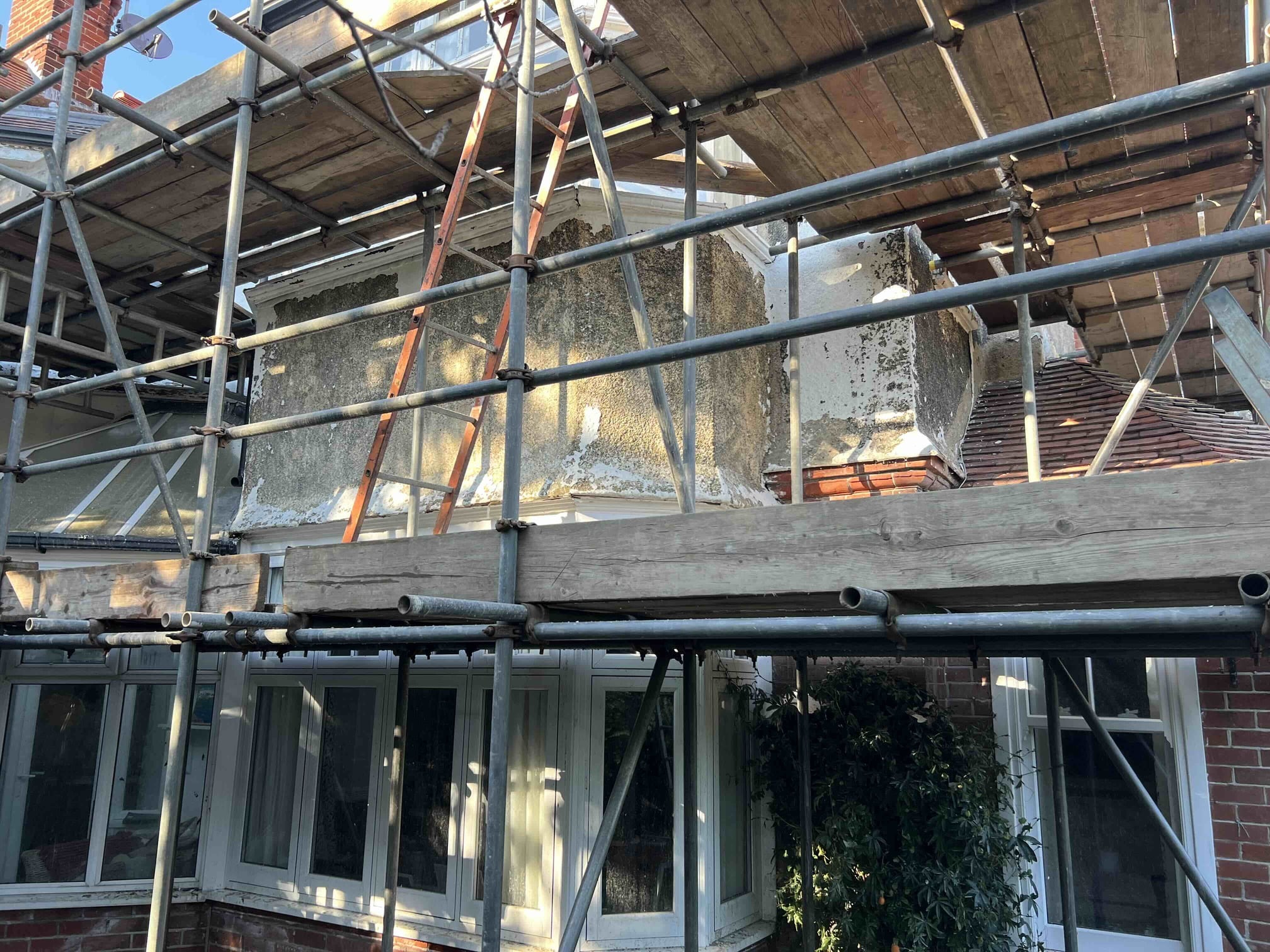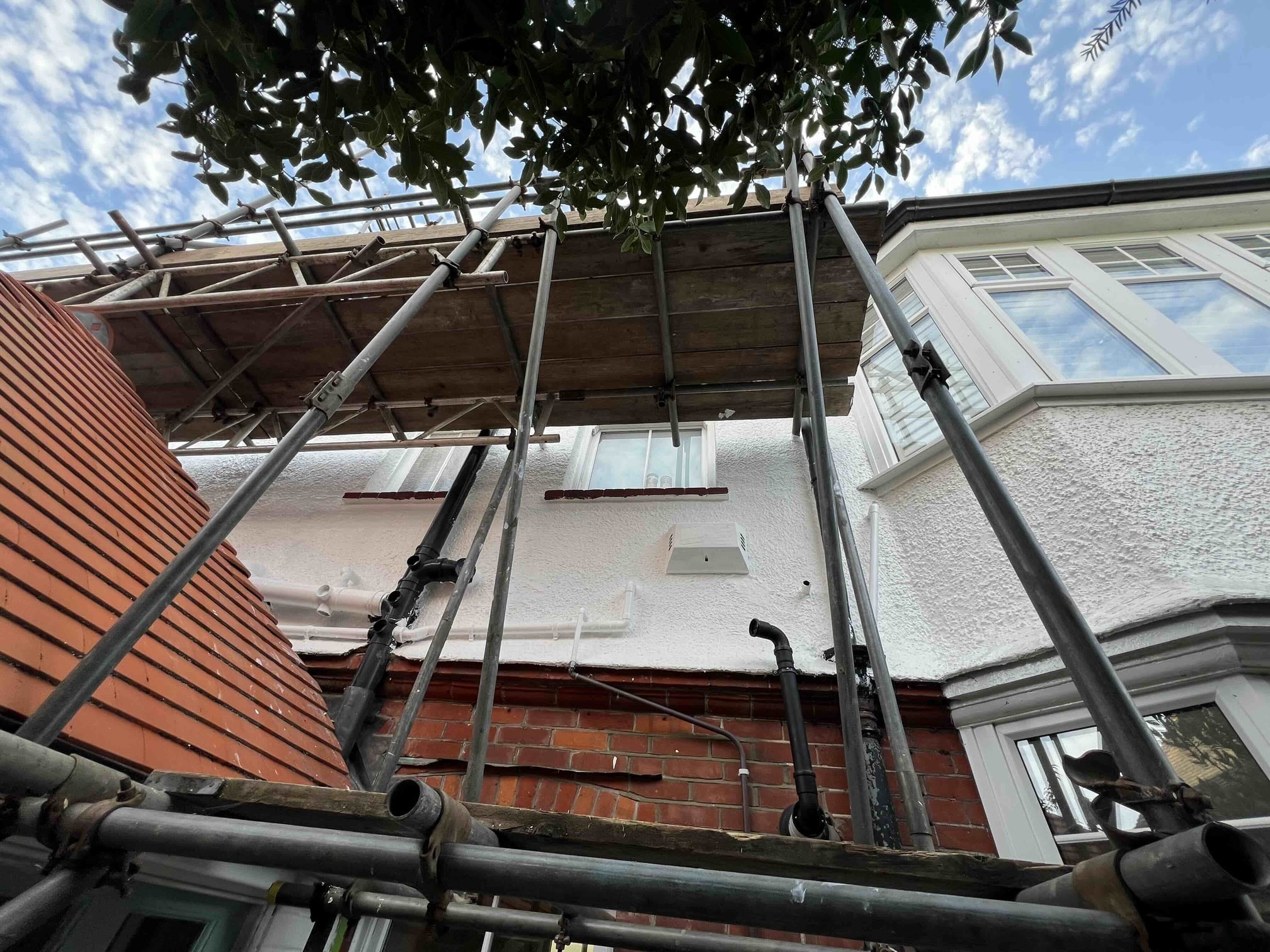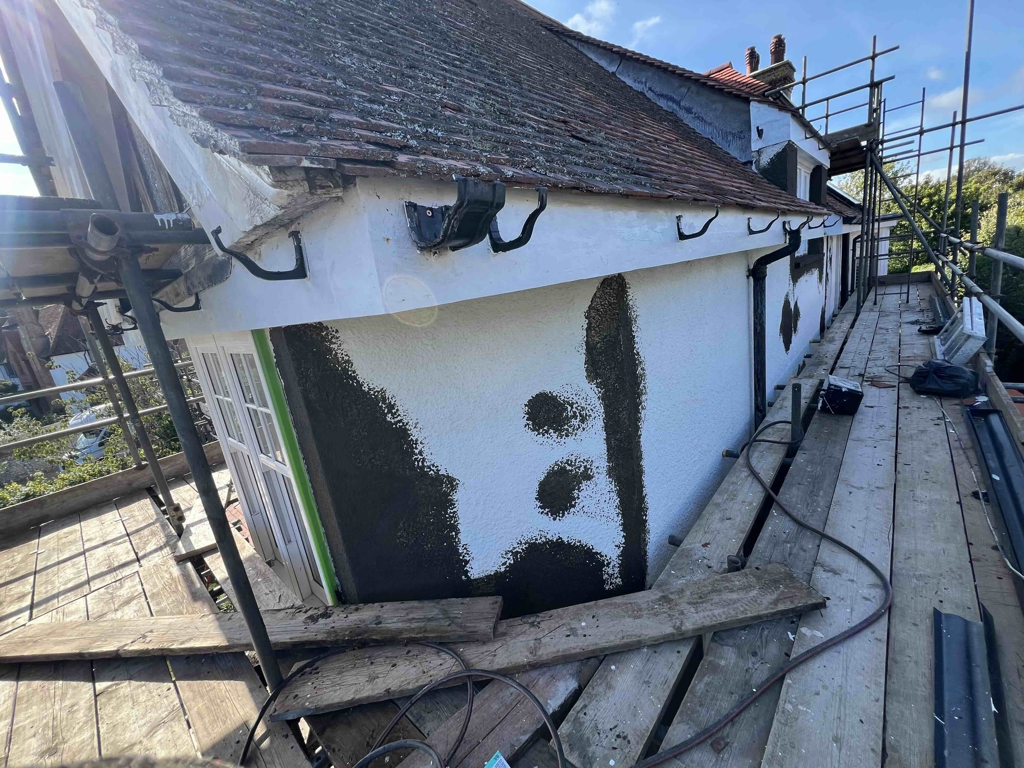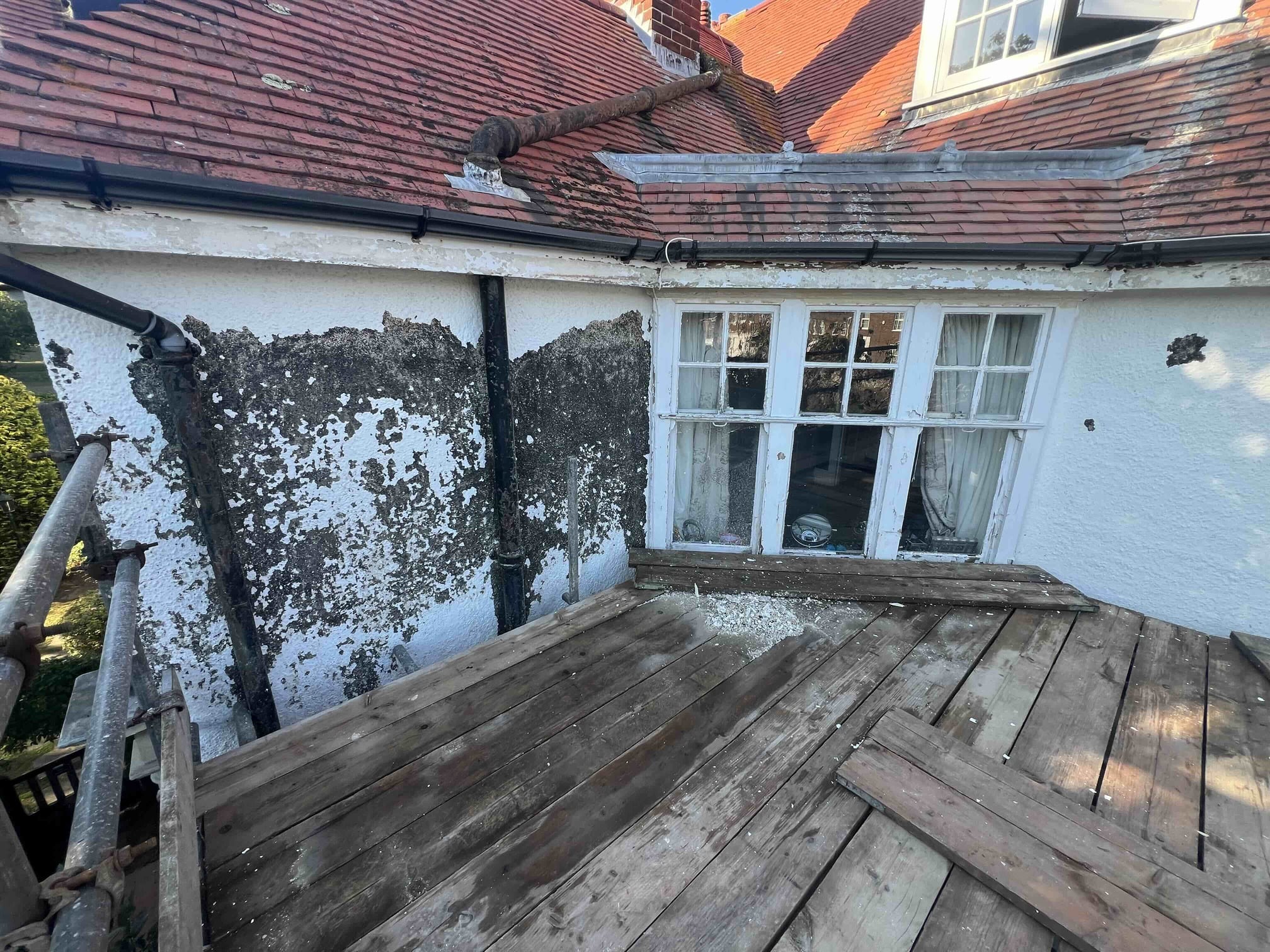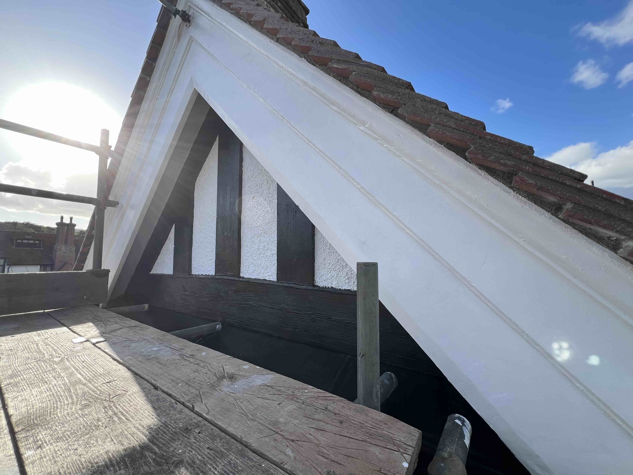 External repair and refurbishment works were carried out on a residential property in Eastbourne, where the building required extensive maintenance. Scaffolding was erected to allow full access to the façade, which had areas of crumbling render, loose mortar, deteriorated woodwork and flaking paint. Repairs included scraping back unstable mortar, sanding and restoring timber elements, and using epoxy to rebuild damaged sections of woodwork and seal gaps around roof tiles. Cement was applied to repair defective areas of the exterior before being finished in white paint. The front door was also sanded and repainted, leaving the property fully restored and looking like new.