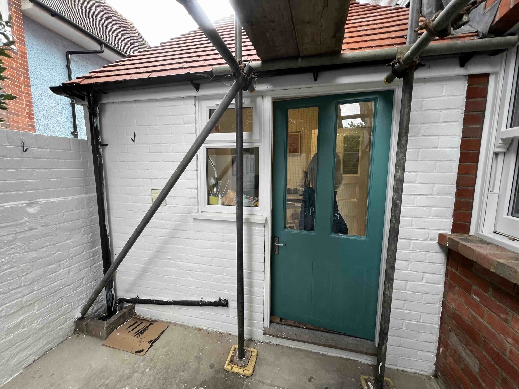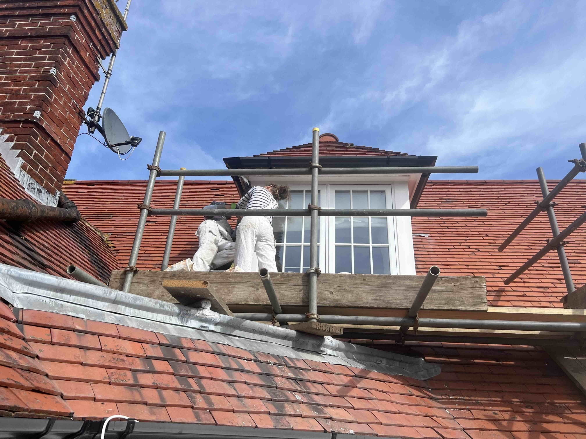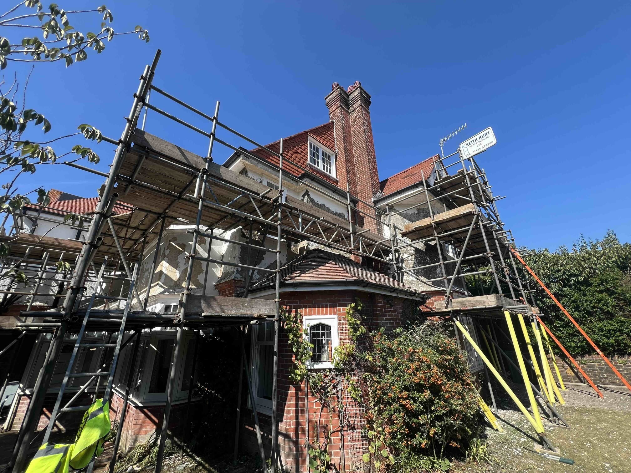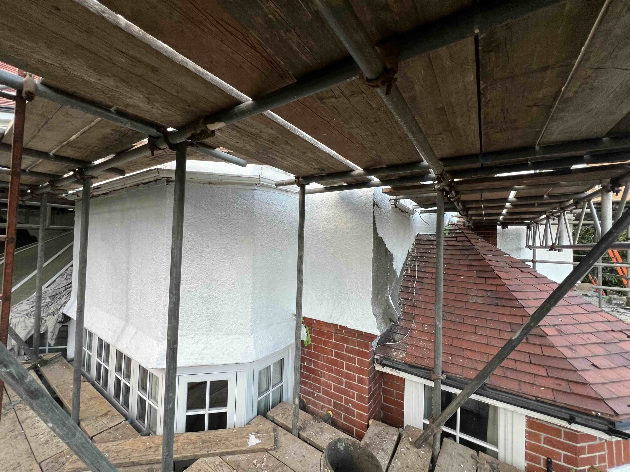 External repair and refurbishment works were carried out on a residential property in Eastbourne, where the building required extensive maintenance. Scaffolding was erected to allow full access to the façade, which had areas of crumbling render, loose mortar, deteriorated woodwork and flaking paint. Repairs included scraping back unstable mortar, sanding and restoring timber elements, and using epoxy to rebuild damaged sections of woodwork and seal gaps around roof tiles. Cement was applied to repair defective areas of the exterior before being finished in white paint. The front door was also sanded and repainted, leaving the property fully restored and looking like new.