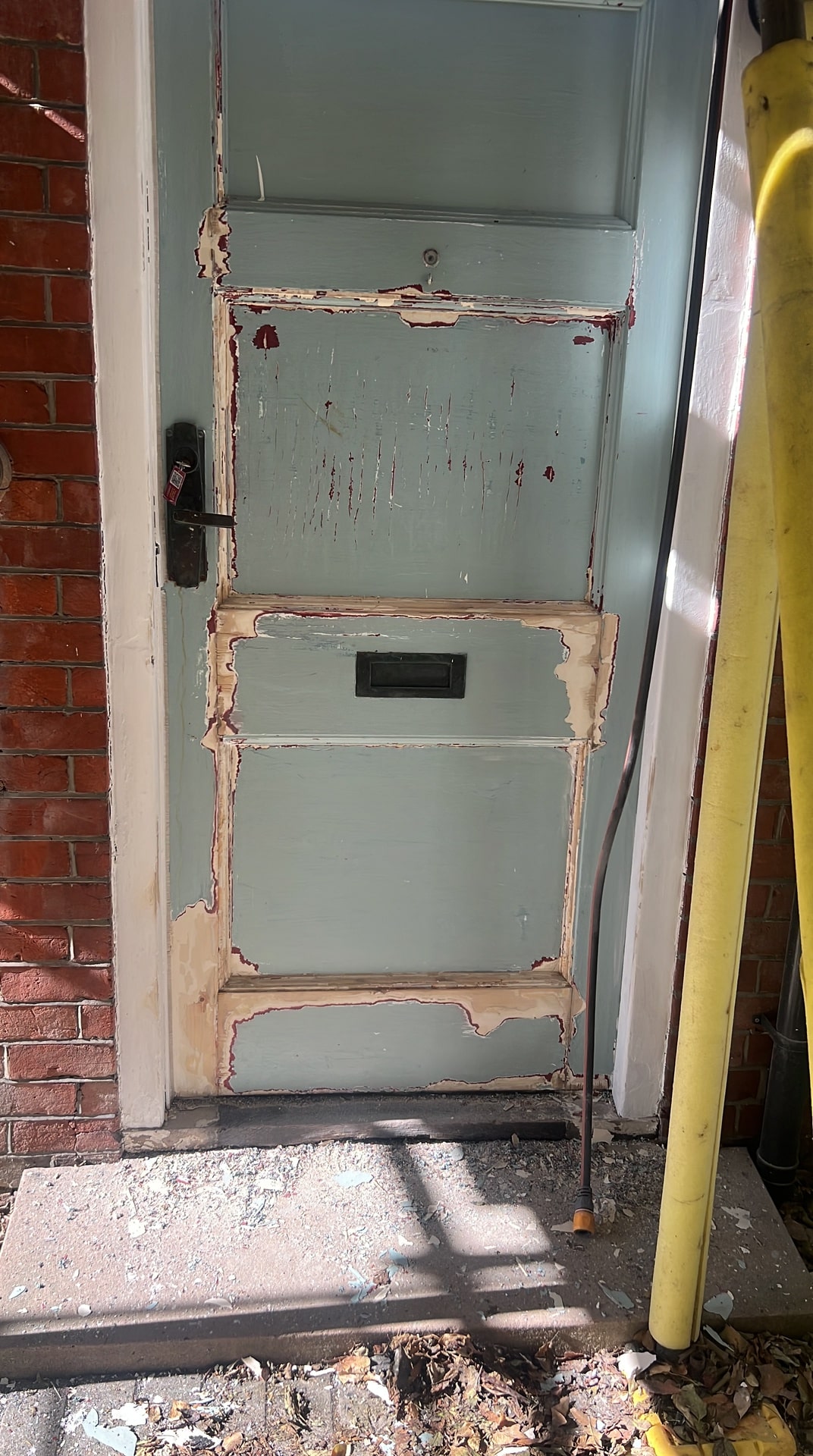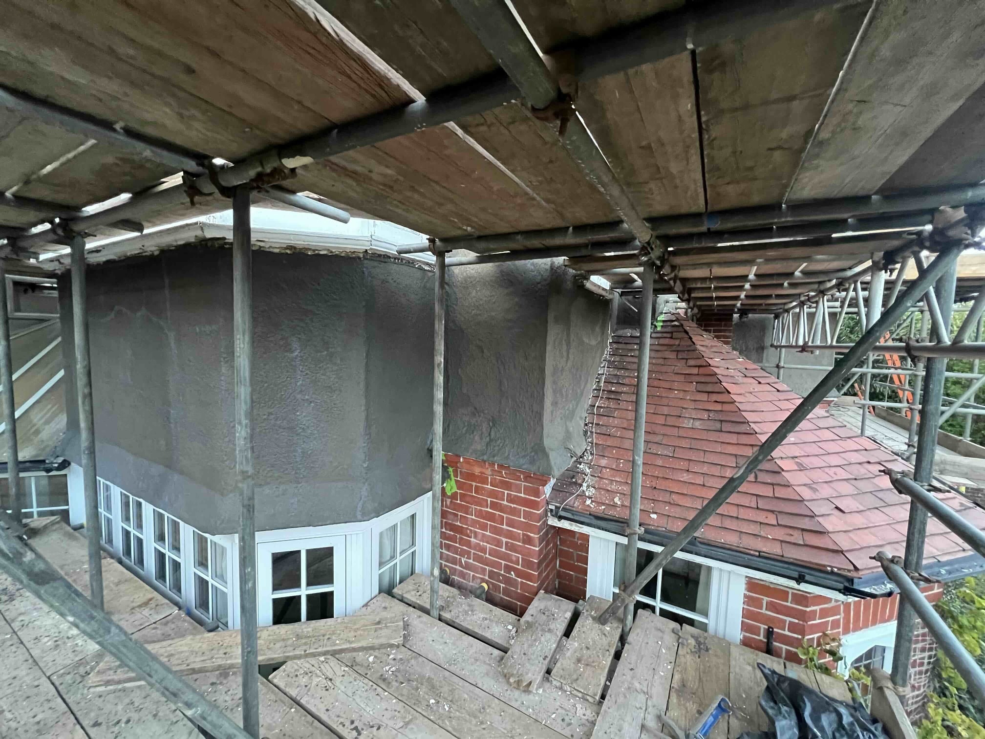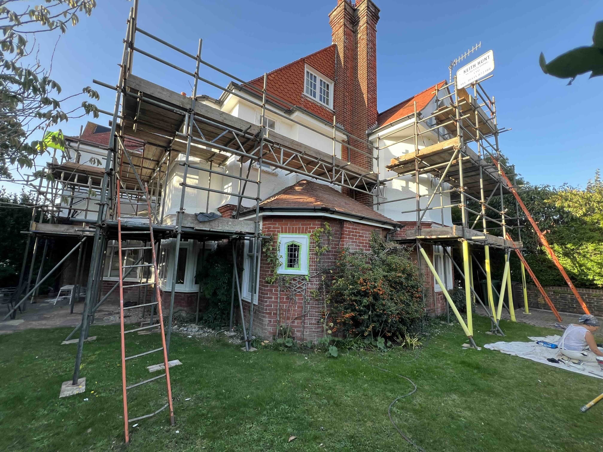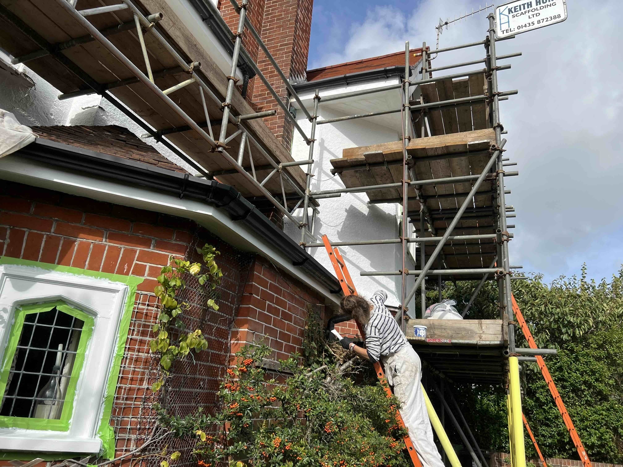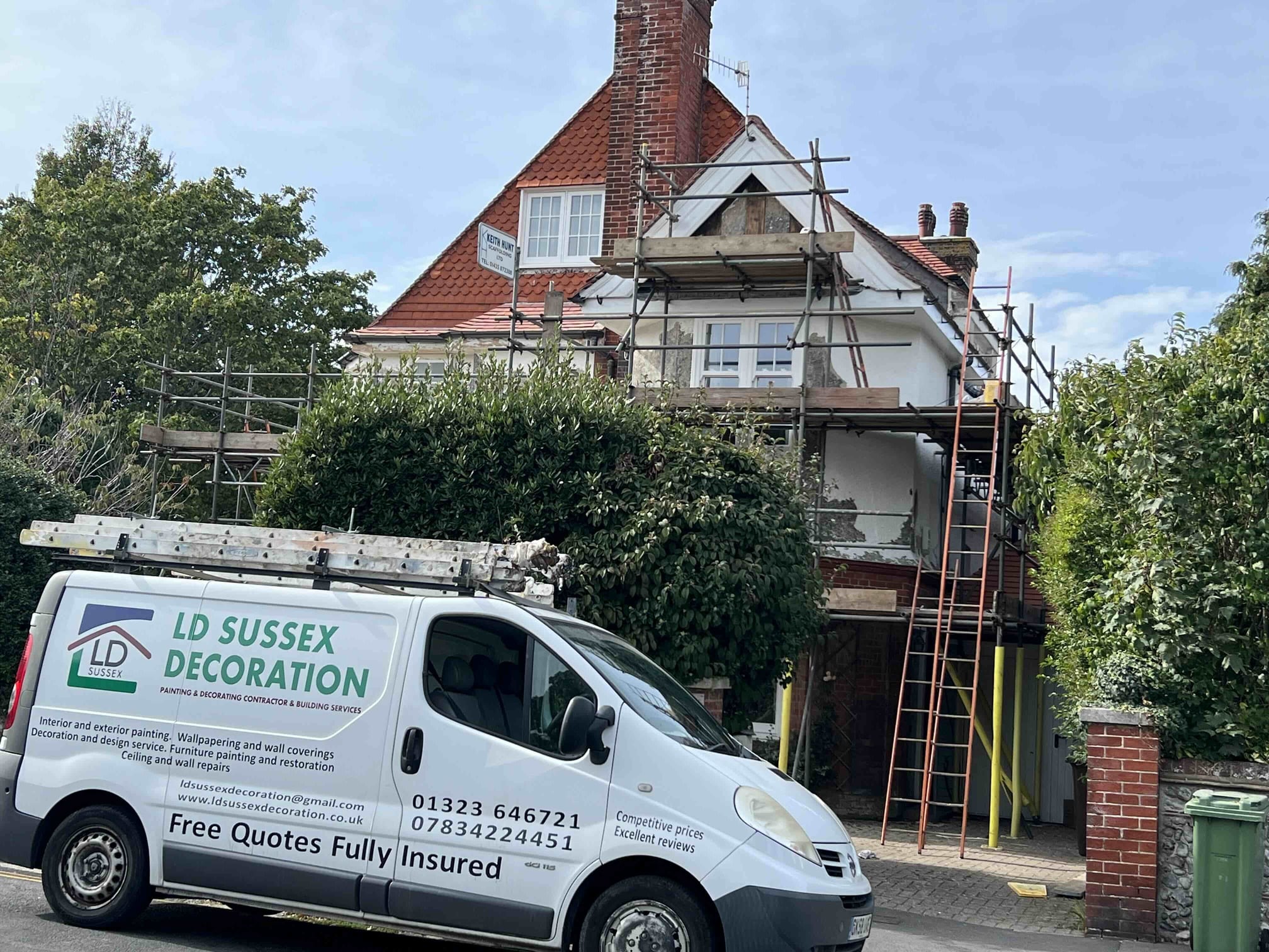 External repair and refurbishment works were carried out on a residential property in Eastbourne, where the building required extensive maintenance. Scaffolding was erected to allow full access to the façade, which had areas of crumbling render, loose mortar, deteriorated woodwork and flaking paint. Repairs included scraping back unstable mortar, sanding and restoring timber elements, and using epoxy to rebuild damaged sections of woodwork and seal gaps around roof tiles. Cement was applied to repair defective areas of the exterior before being finished in white paint. The front door was also sanded and repainted, leaving the property fully restored and looking like new.