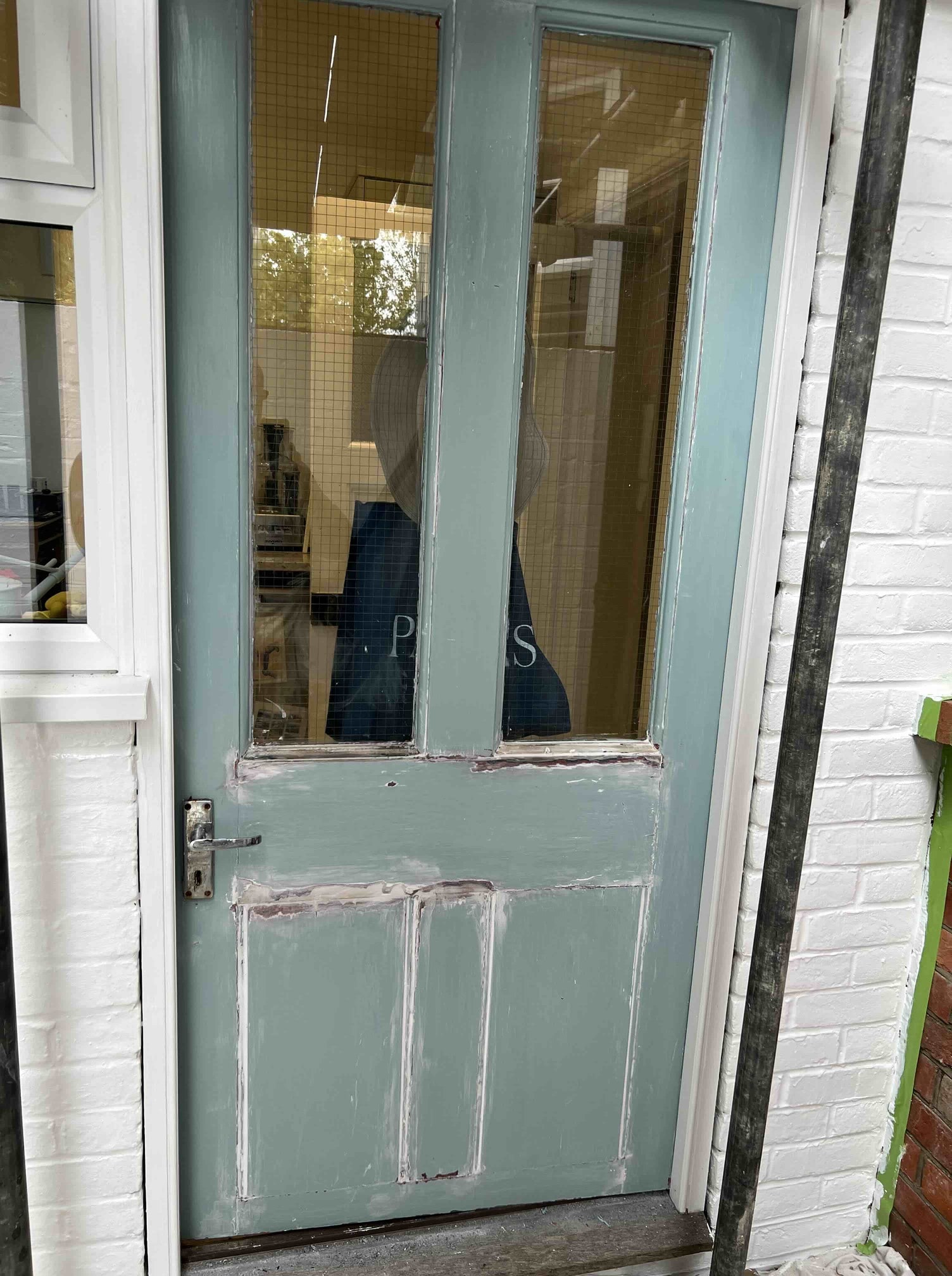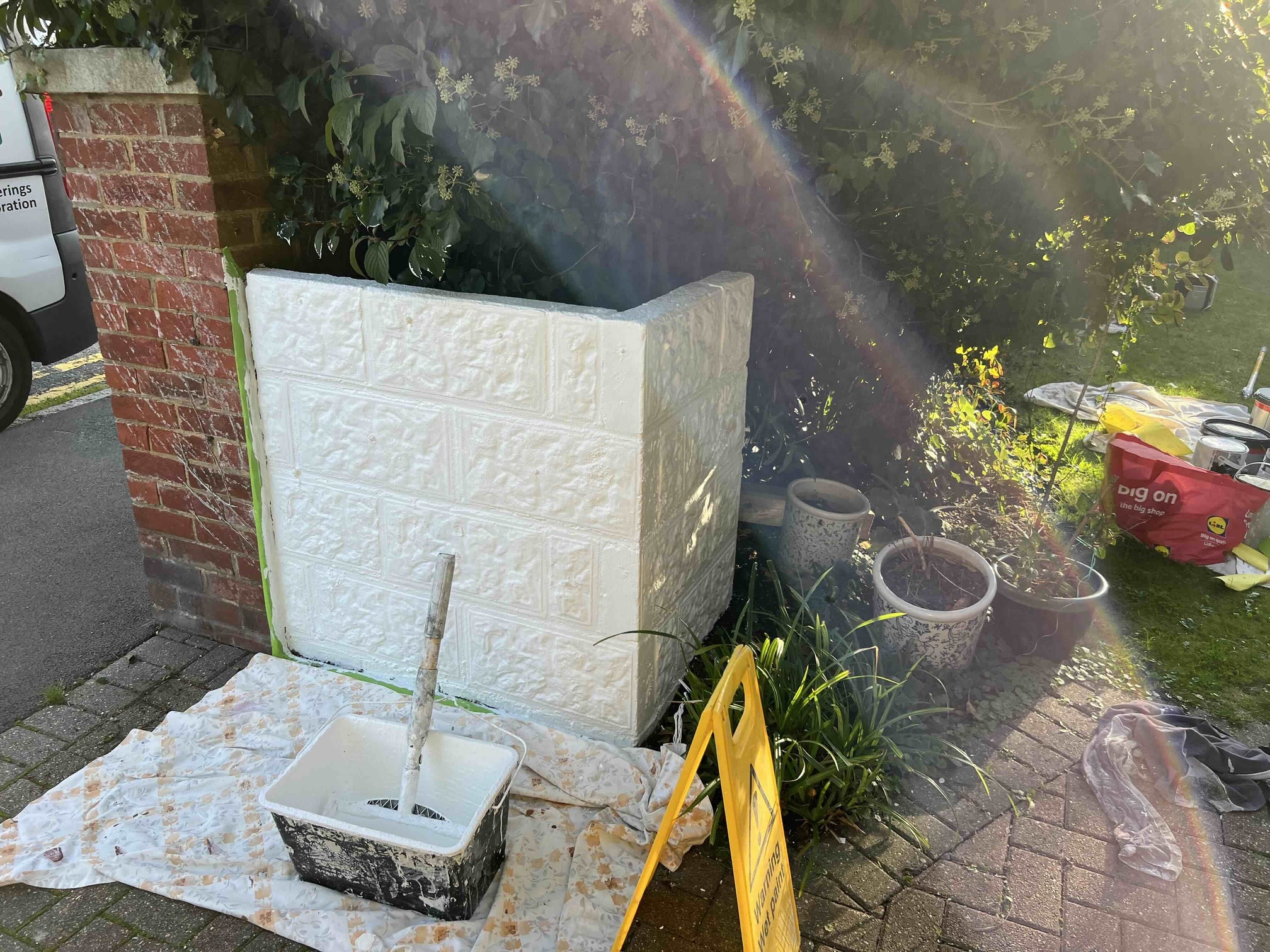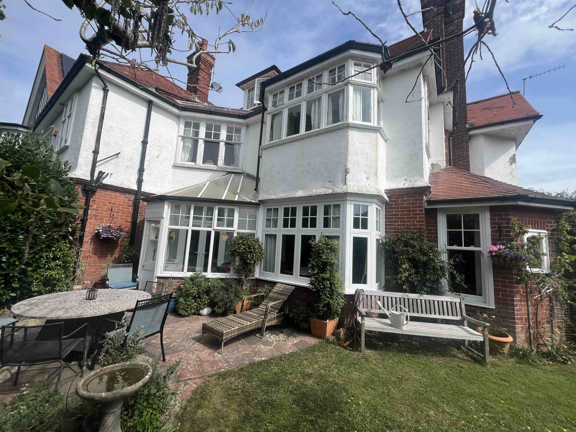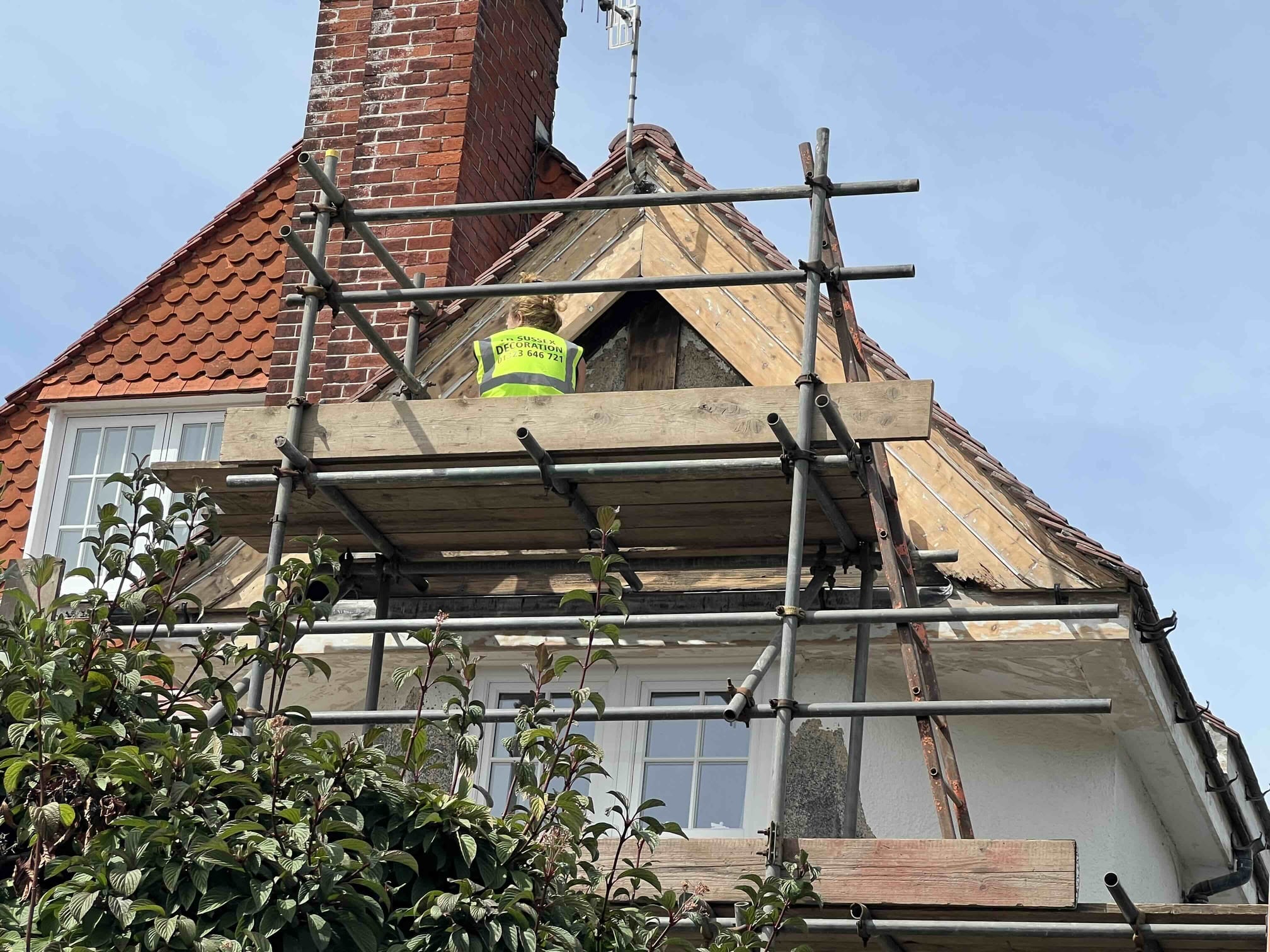 External repair and refurbishment works were carried out on a residential property in Eastbourne, where the building required extensive maintenance. Scaffolding was erected to allow full access to the façade, which had areas of crumbling render, loose mortar, deteriorated woodwork and flaking paint. Repairs included scraping back unstable mortar, sanding and restoring timber elements, and using epoxy to rebuild damaged sections of woodwork and seal gaps around roof tiles. Cement was applied to repair defective areas of the exterior before being finished in white paint. The front door was also sanded and repainted, leaving the property fully restored and looking like new.