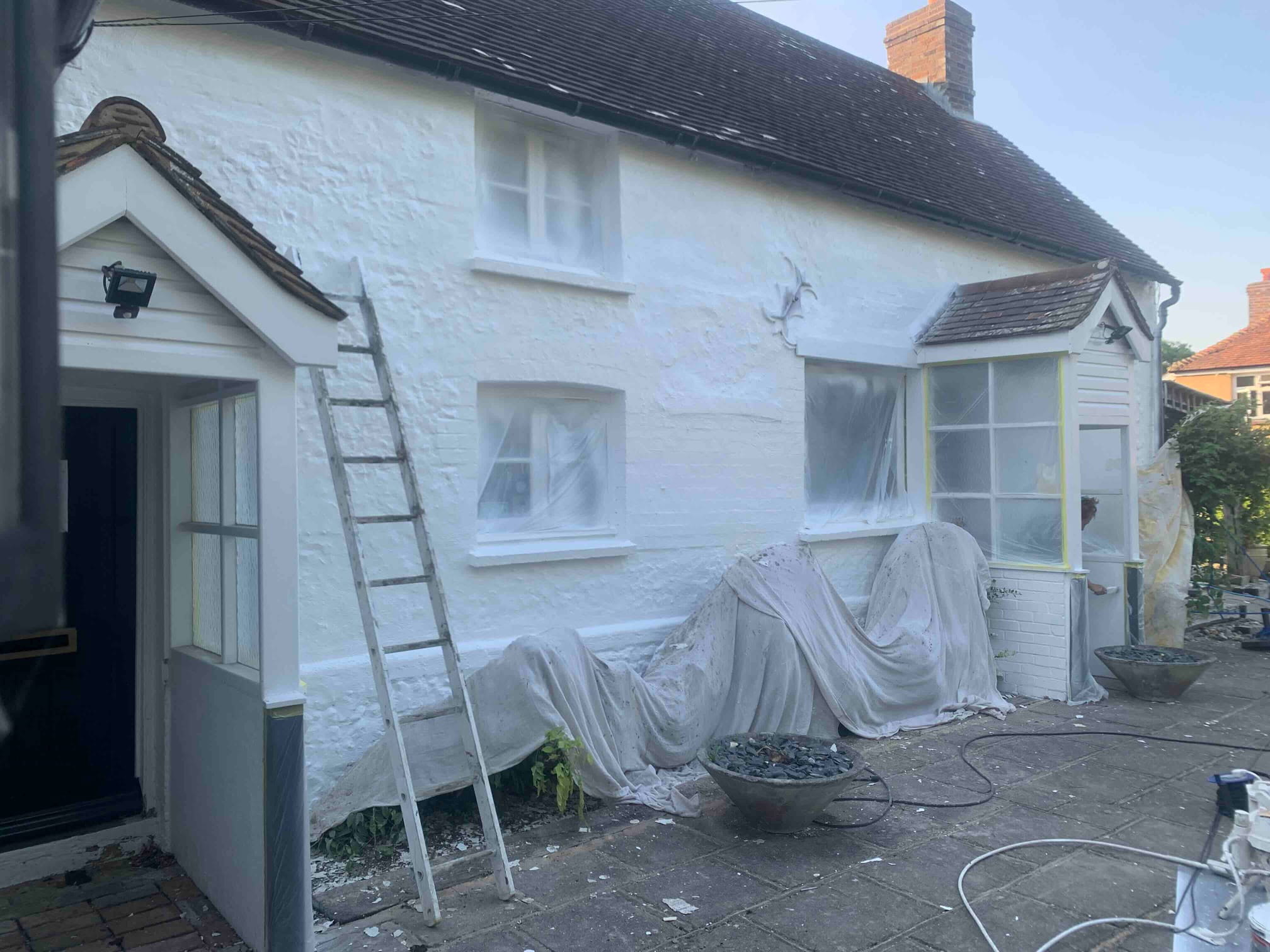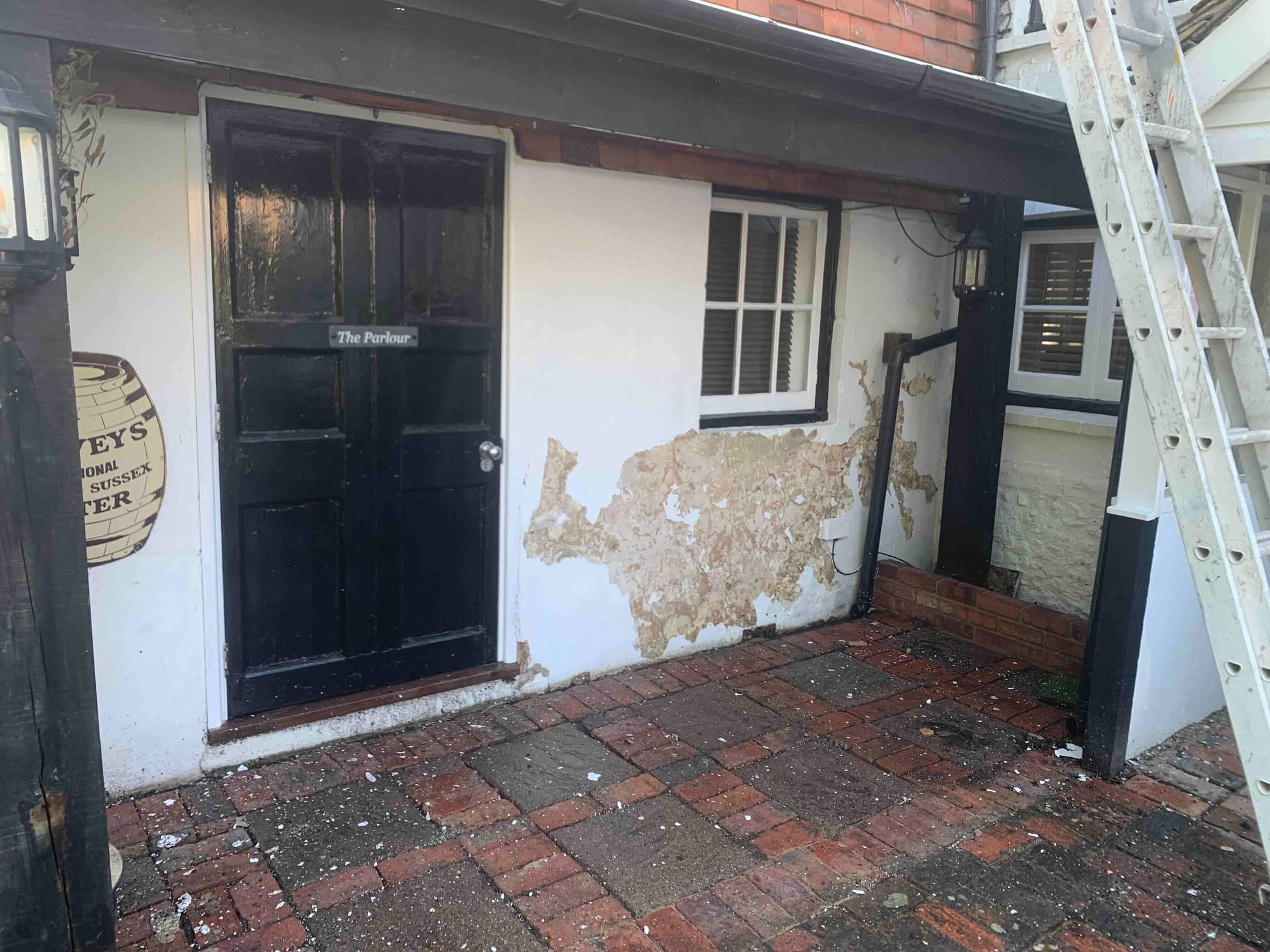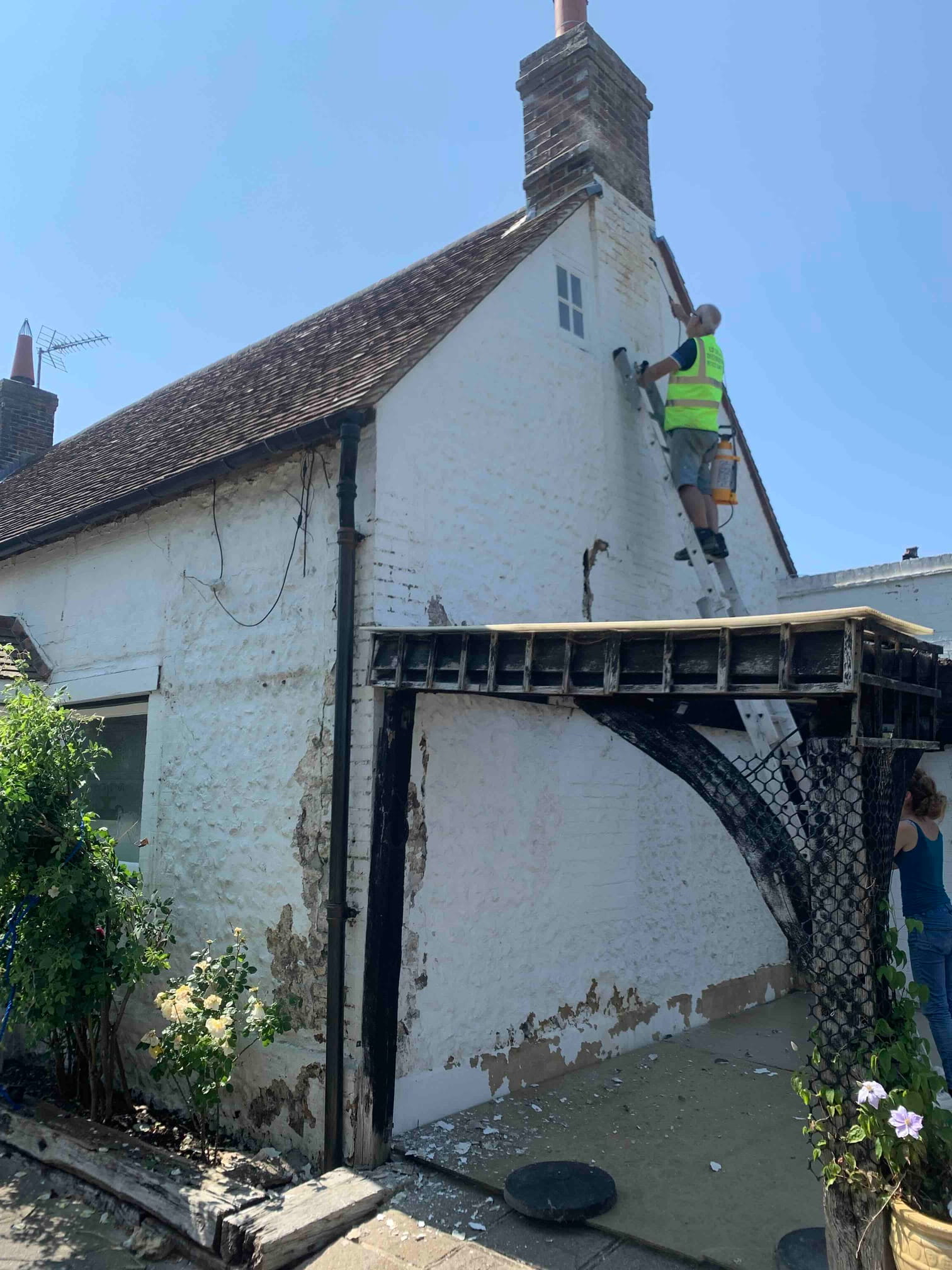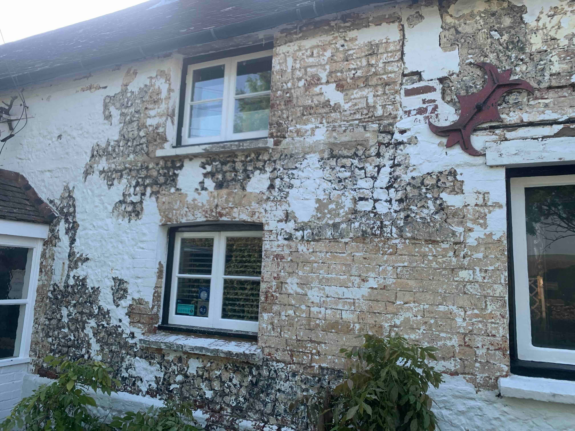 External repair and refurbishment works were undertaken on a traditional period cottage in Alciston, East Sussex, with care taken to preserve the character of the building. Areas of loose and deteriorating exterior material were carefully stripped back, and cracks within the walls were stabilised using epoxy sealant before being sensitively repaired with mortar. Flaking paint was removed from the window frames to allow for proper preparation and longevity. The exterior walls were then repainted using an industrial-grade airless sprayer to achieve a consistent finish. Final works included the detailed painting of supporting metalwork, window frames and the front door, leaving the cottage protected, refreshed and in keeping with its original character.