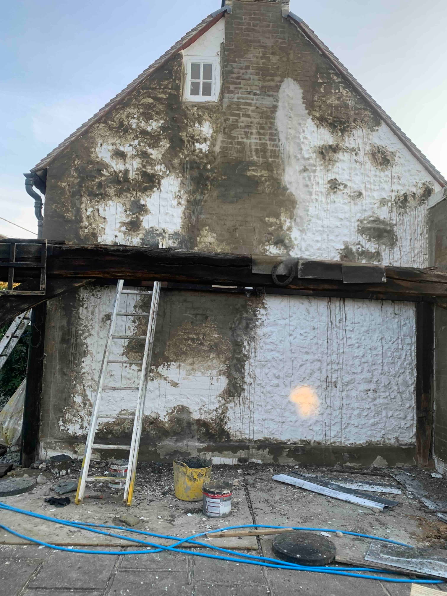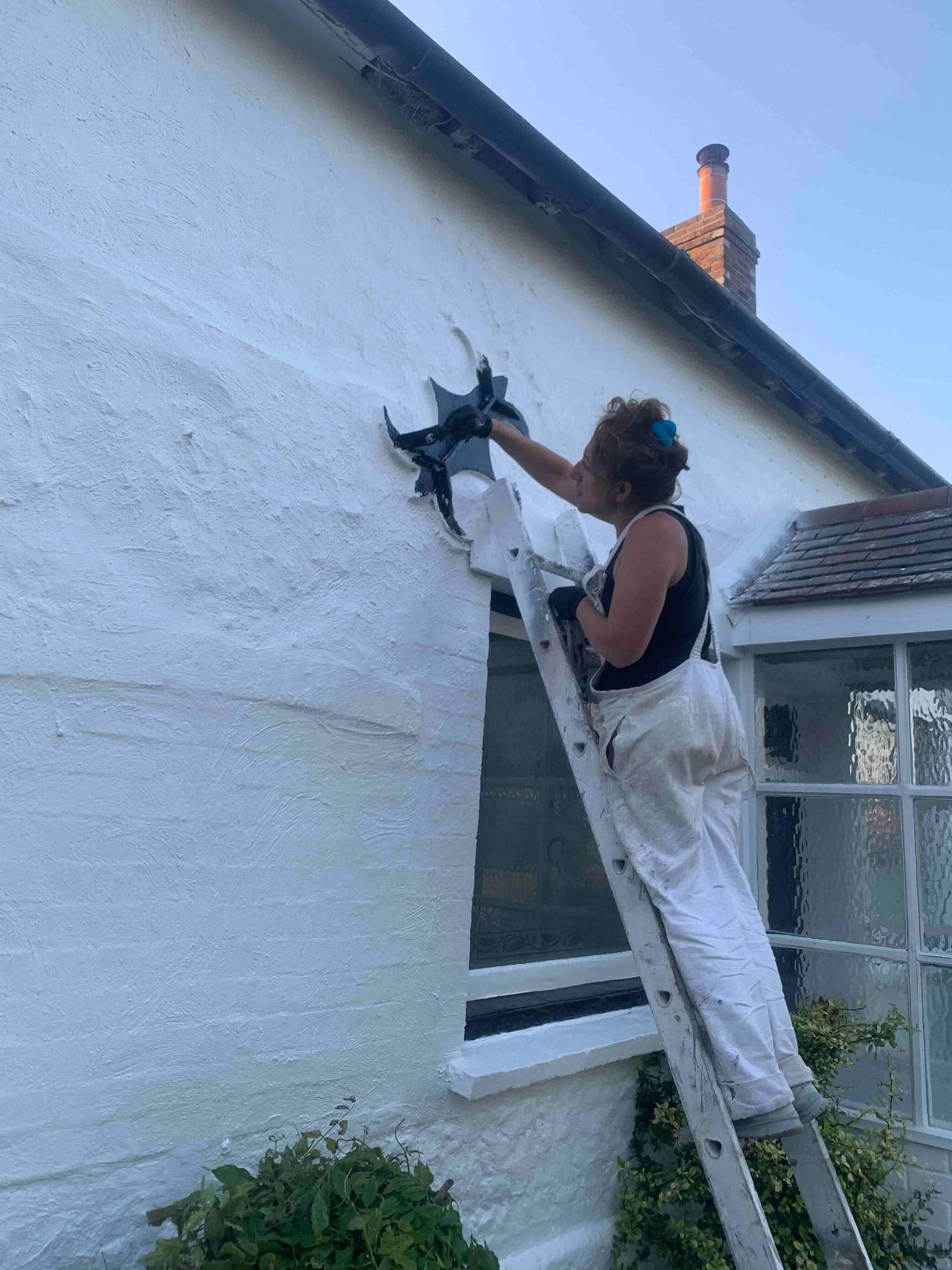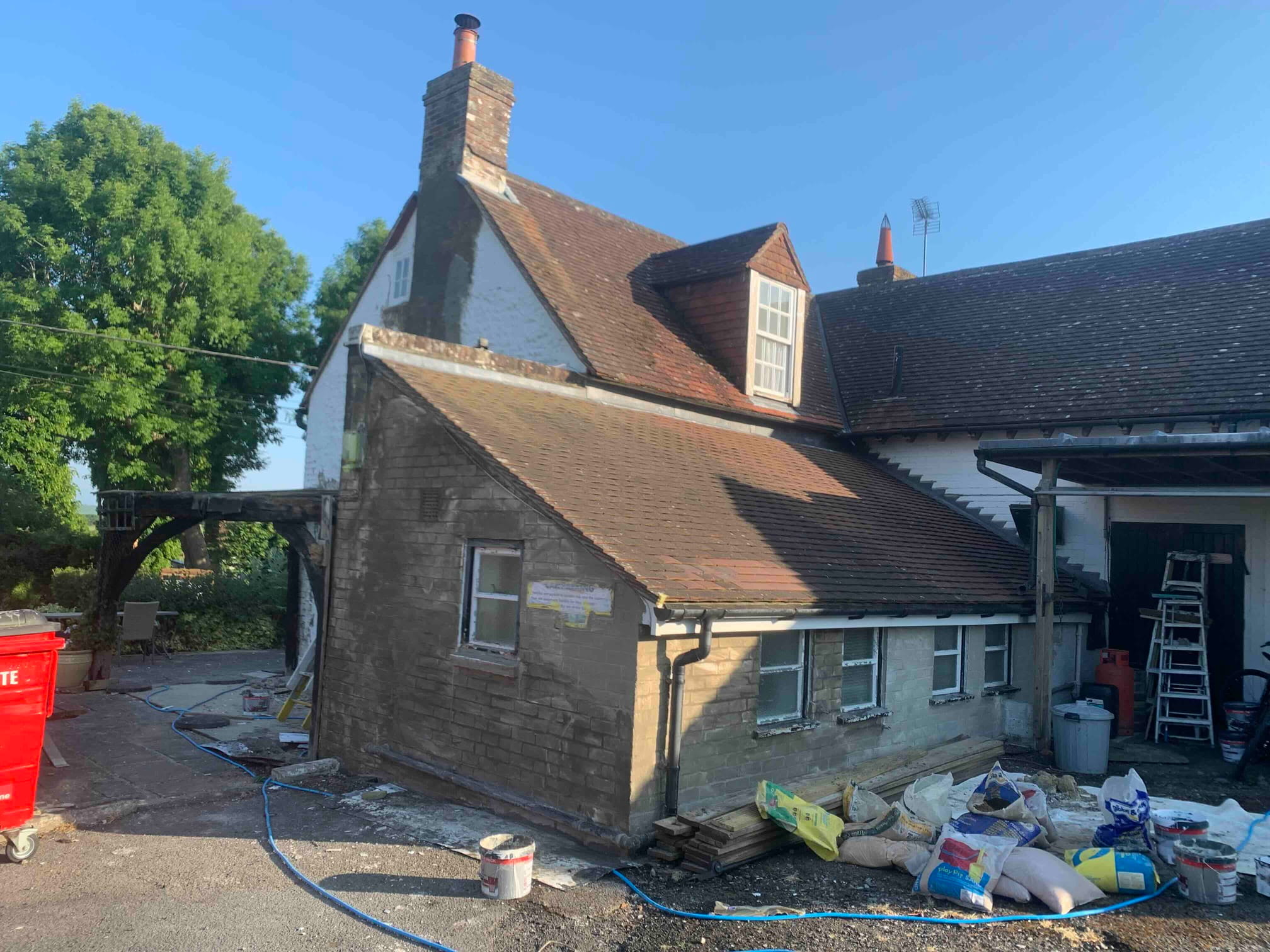 External repair and refurbishment works were undertaken on a traditional period cottage in Alciston, East Sussex, with care taken to preserve the character of the building. Areas of loose and deteriorating exterior material were carefully stripped back, and cracks within the walls were stabilised using epoxy sealant before being sensitively repaired with mortar. Flaking paint was removed from the window frames to allow for proper preparation and longevity. The exterior walls were then repainted using an industrial-grade airless sprayer to achieve a consistent finish. Final works included the detailed painting of supporting metalwork, window frames and the front door, leaving the cottage protected, refreshed and in keeping with its original character.
