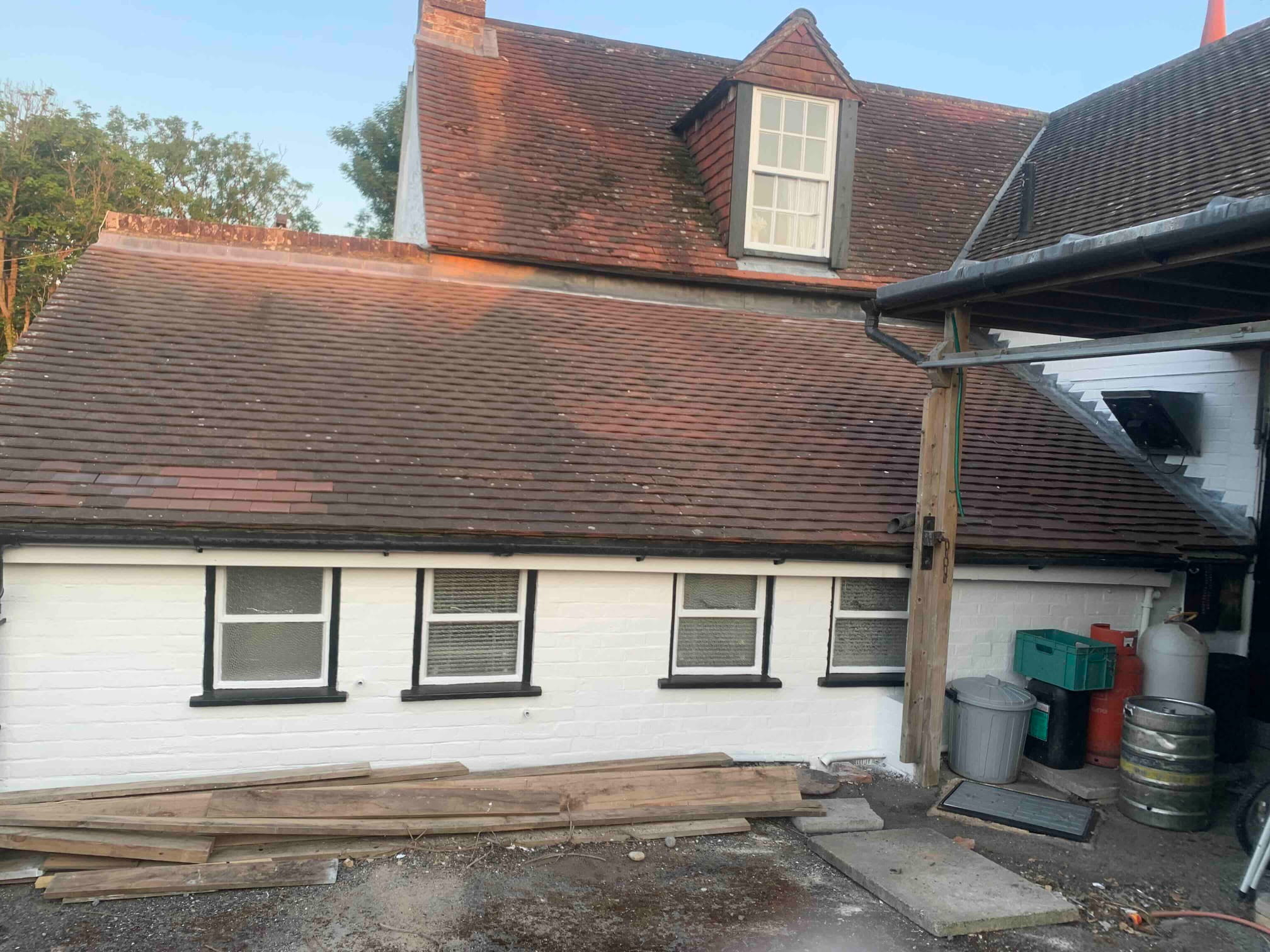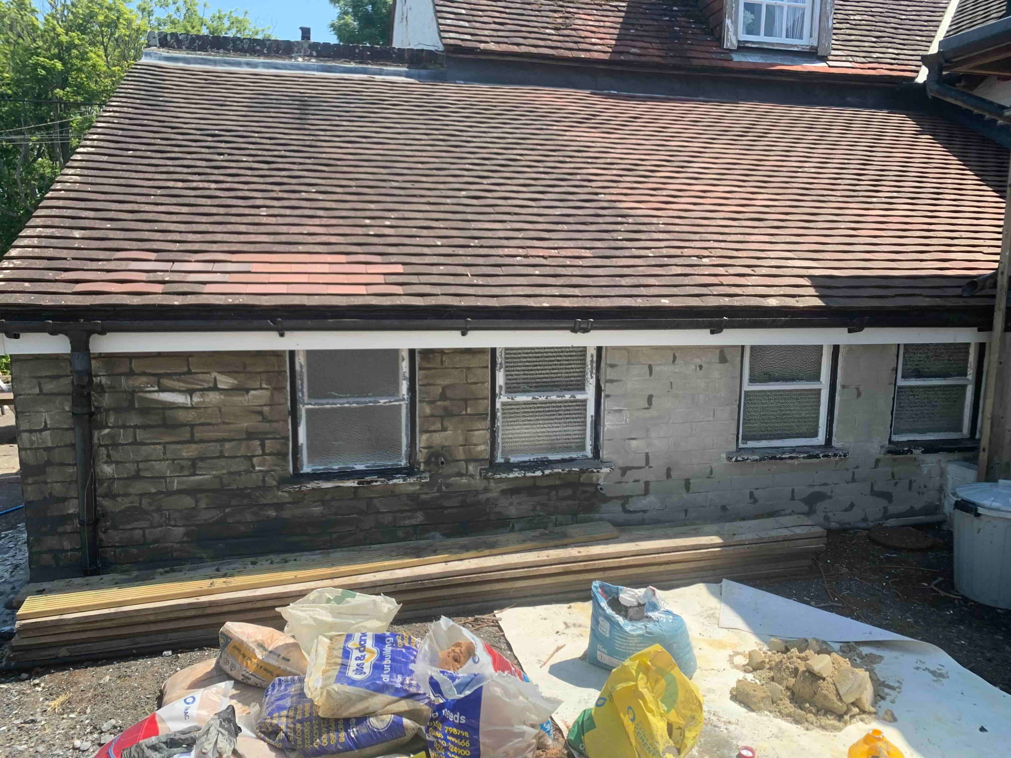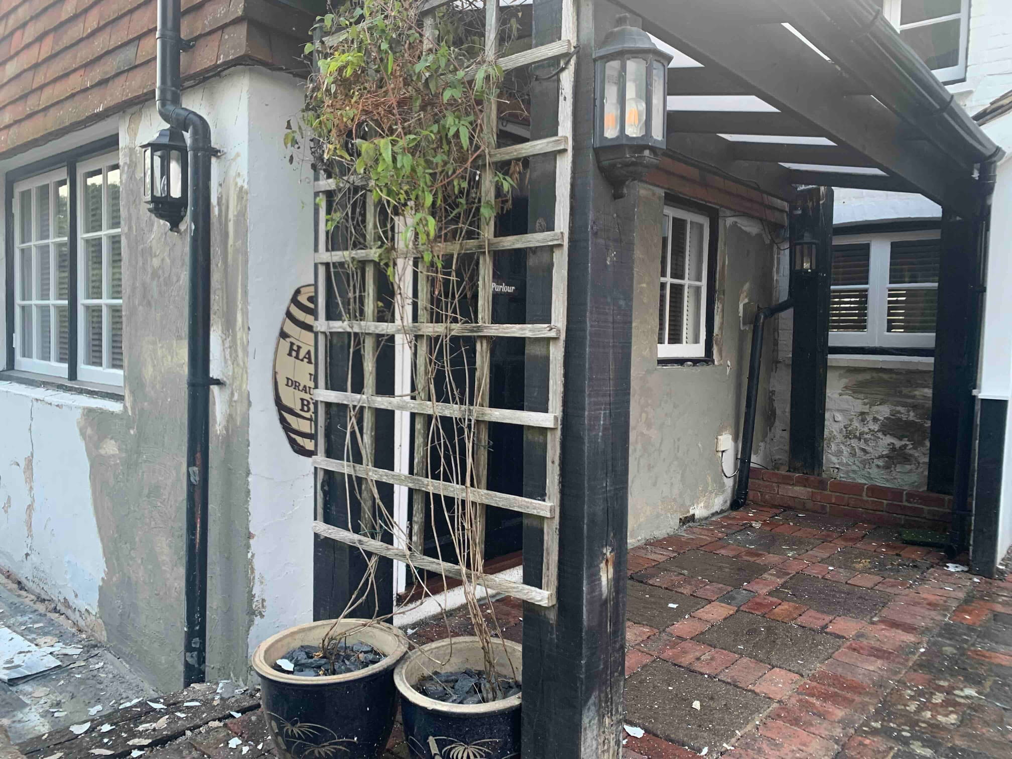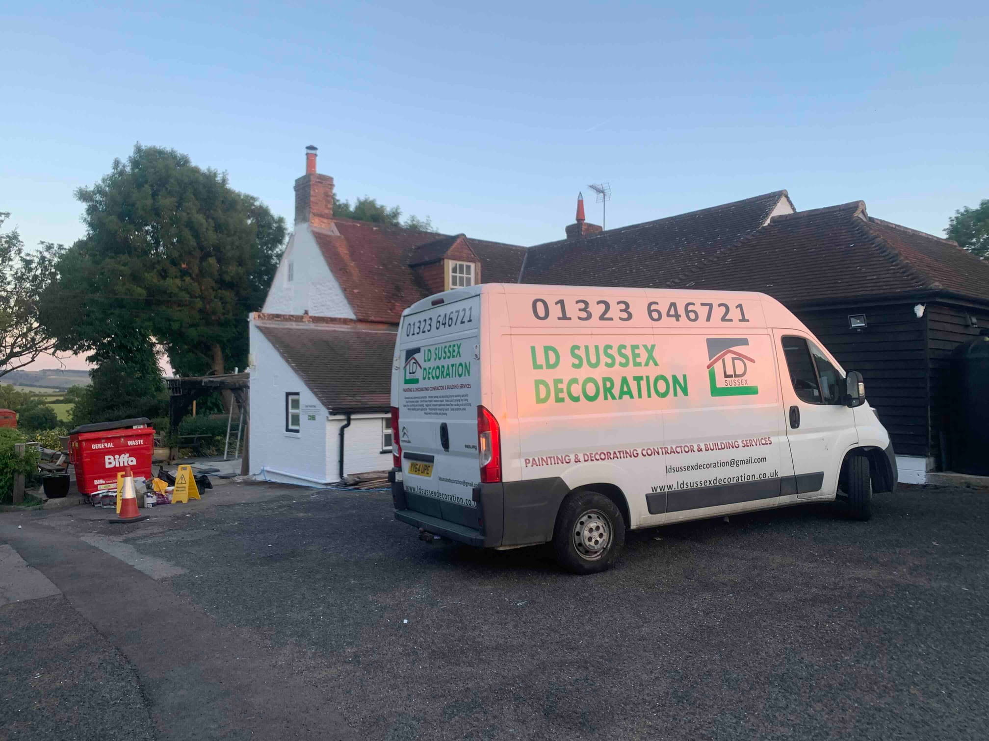 External repair and refurbishment works were undertaken on a traditional period cottage in Alciston, East Sussex, with care taken to preserve the character of the building. Areas of loose and deteriorating exterior material were carefully stripped back, and cracks within the walls were stabilised using epoxy sealant before being sensitively repaired with mortar. Flaking paint was removed from the window frames to allow for proper preparation and longevity. The exterior walls were then repainted using an industrial-grade airless sprayer to achieve a consistent finish. Final works included the detailed painting of supporting metalwork, window frames and the front door, leaving the cottage protected, refreshed and in keeping with its original character.